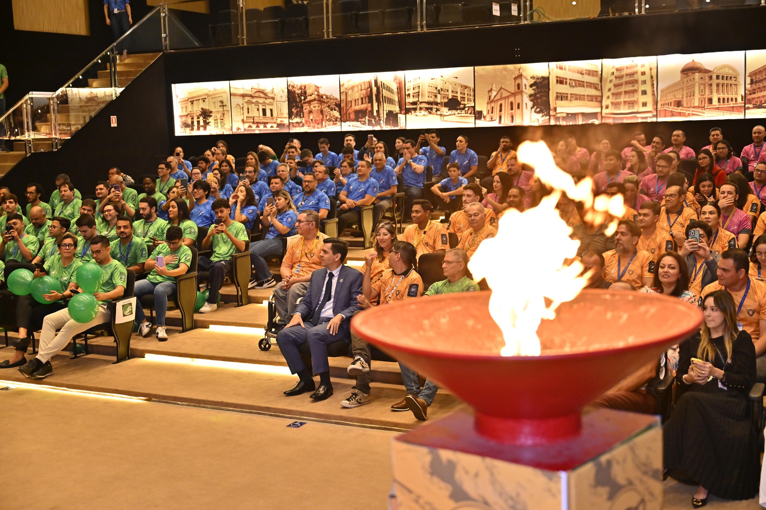 Com o auditório repleto de servidores uniformizados com as cores de suas equipes — Boto,…